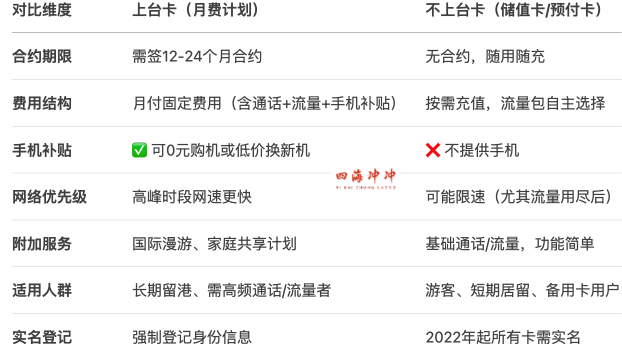 储值卡:免合约、在便利店/口岸/营业厅都可以即买即用,适合游客/短期停留/低成本养卡。价格较低、灵活充值但无手机补贴,高峰网速可能受限.