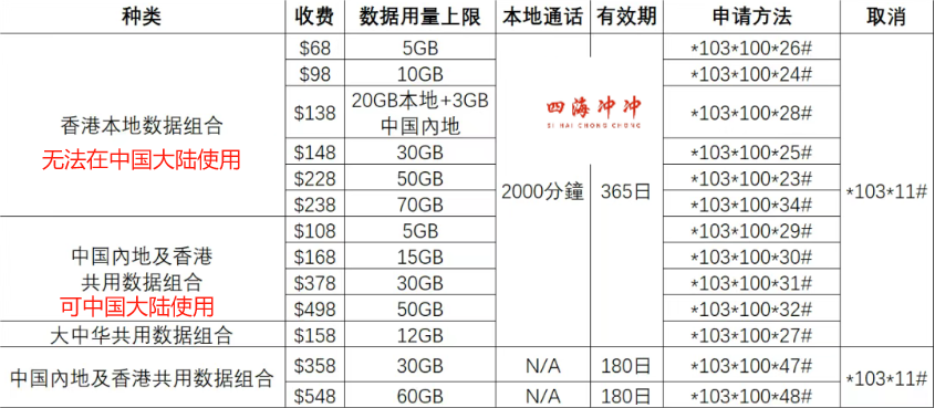 二:常规香港上台卡/储值卡开通流量则需要先在公众号:四海冲冲 ,充值港币话费再拨打代码开通流量或在运营商APP开通流量包。
